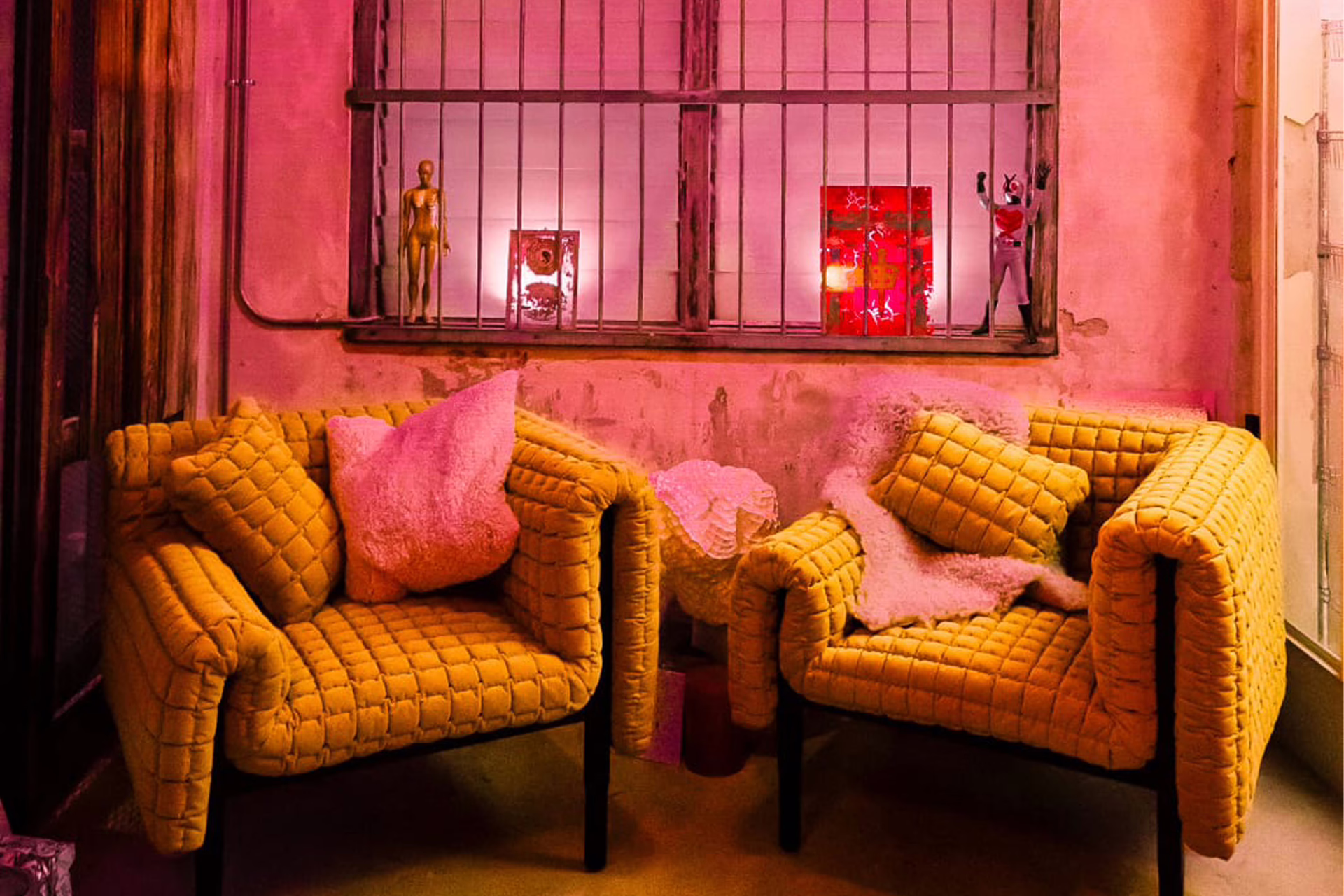Adding to the grunge-chic eeriness is a fermentation lab displaying dozens of pickle jars, as well as multi-coloured dining tables made from repurposed plastic.