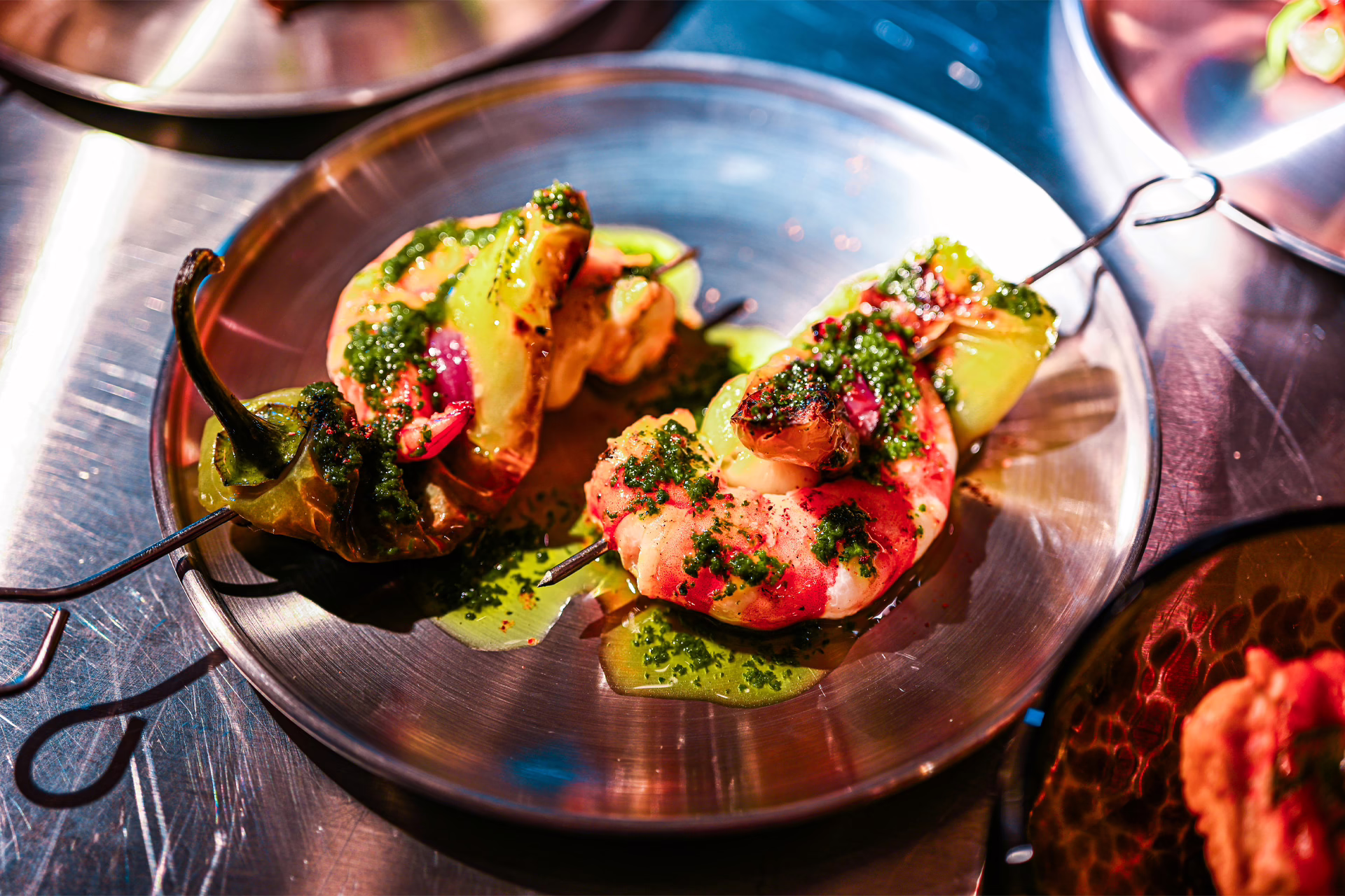 Bites like prawn skewers with sweet chilli brasucade and fried soft-shell crab aglio olio pack a flavourful punch. A guava sorbet with vanilla wraps up this inventive meal.